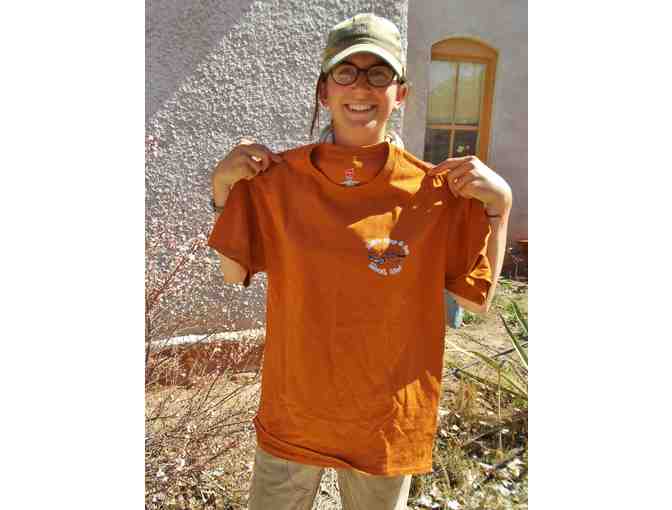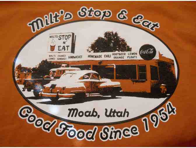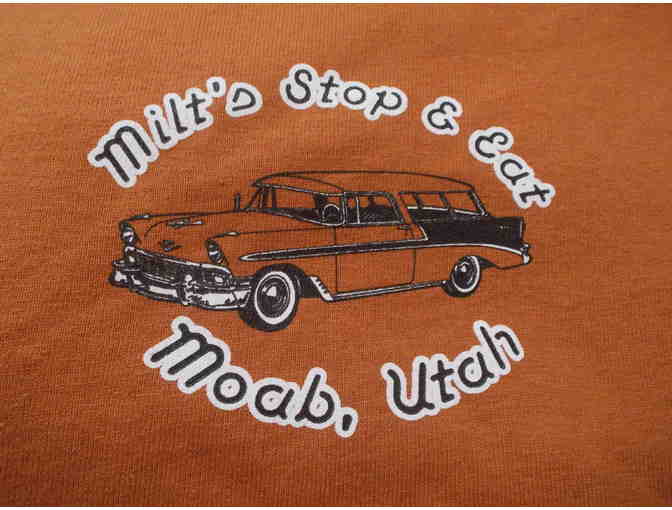 This item is good for one Milt's Stop & Eat burnt orange T-shirt, size adult large. Small b+w chest logo on front; large retro Milt's image on back. 100% cotton.
