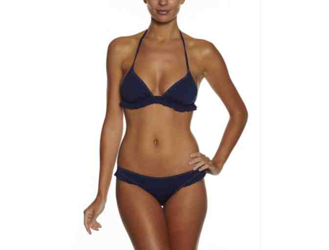 A two-piece navy triangle top with tie on the sides bottom with gold stitching. Size 40 (not as shown in image)