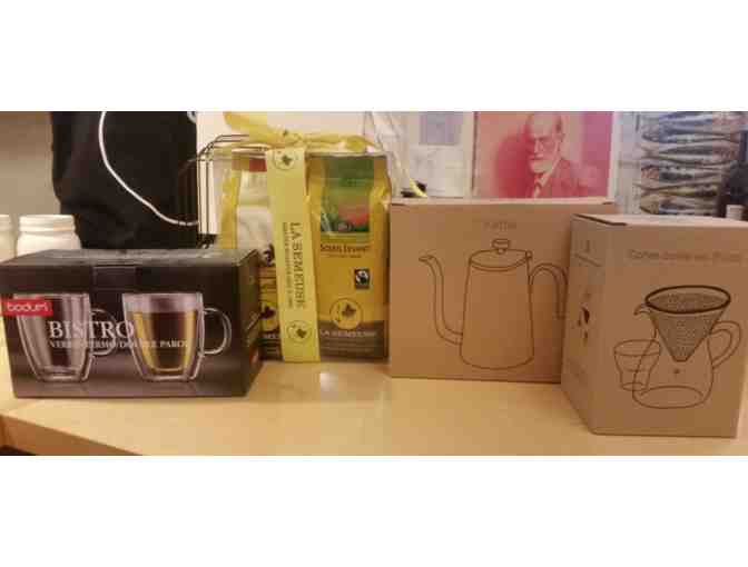 Bodum 2pk Bistro Thermo-glass mugs, La Semeuse 6pk coffee, Kinto Kettle, Kinto Coffee Carafe set 2cup size
