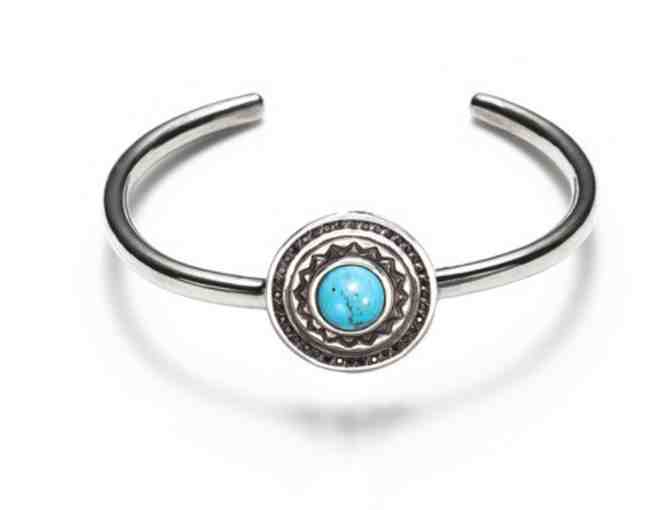 Inspired by Mesoamerican artifacts, this piece features a decorative coin with black spinel pave and a brilliant turquoise cabochon. Available in sterling silver with turquoise and black spinel pave.