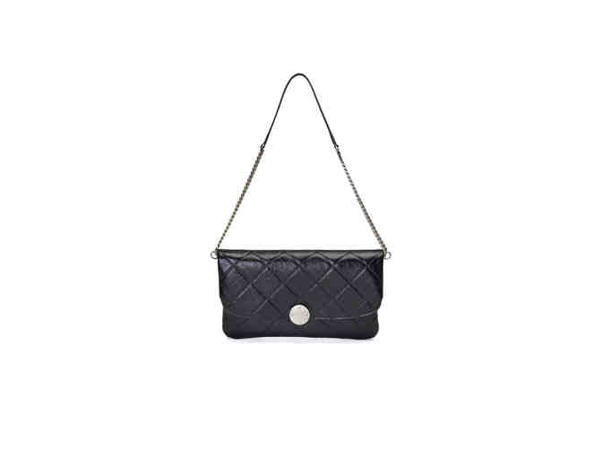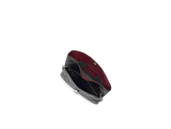 NWT, black quilted, crinkled patent leather, clutch handbag with removable diamond cut chain strap. Lined in black satin with contrast red leather details. Multiple compartments, inner zip pocket and card slots.