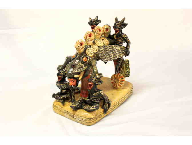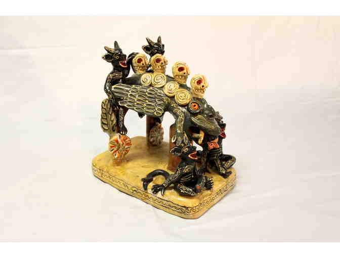 Piece depicts a multi-headed, three-legged beast in the company of four devil/gargoyle-like creatures. Piece is ceramic and measures approximately 12 long by 6 wide by 8 tall.