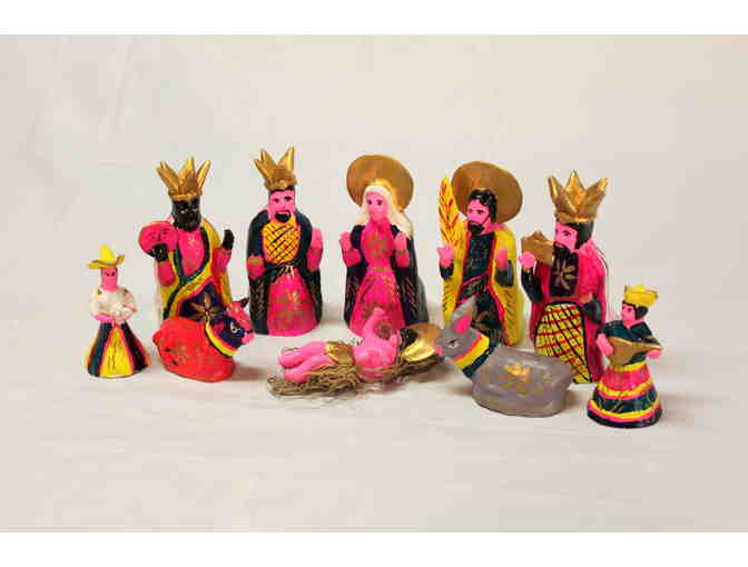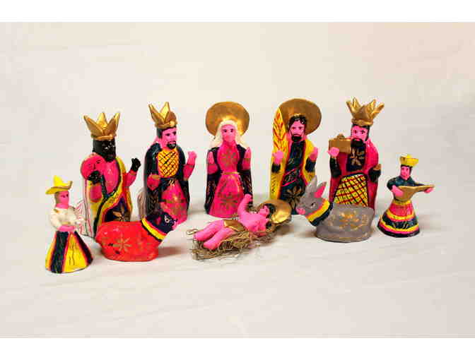 Painted ceramic 10-piece set. Set includes Joseph, Mary, three kings, two children, a bull, a donkey, and infant in a bed of straw. Figures are approximately 5 tall. Animals are approximately 3 long. Infant is approximately 3 tall. Several of the kings hands and crowns are broken and in need of repair (broken pieces are included and ready for glue).