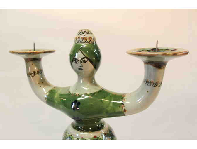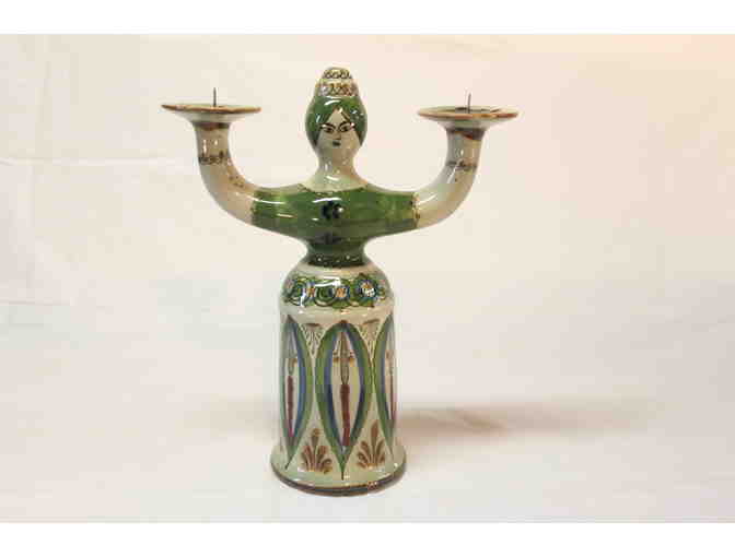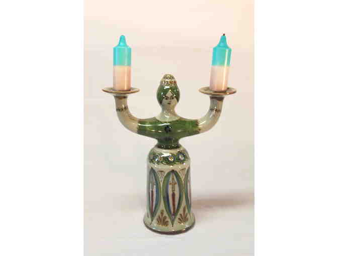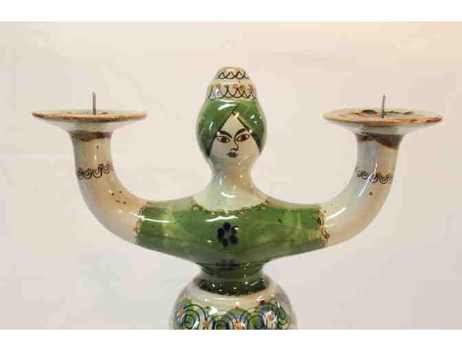 Ceramic green and white candle holder. Measures approximately 14 tall by 8 wide by 5 deep. Two candles shown are included.