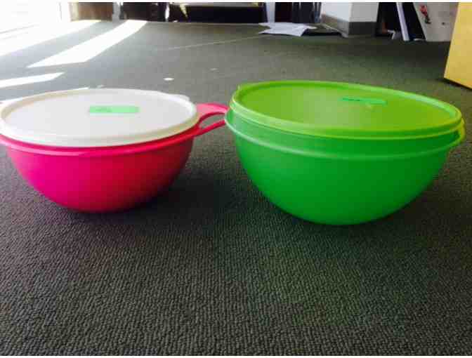 Two tupperware containers. One is pink and holds approximately 6 cups. The other is green and holds a liter or so.