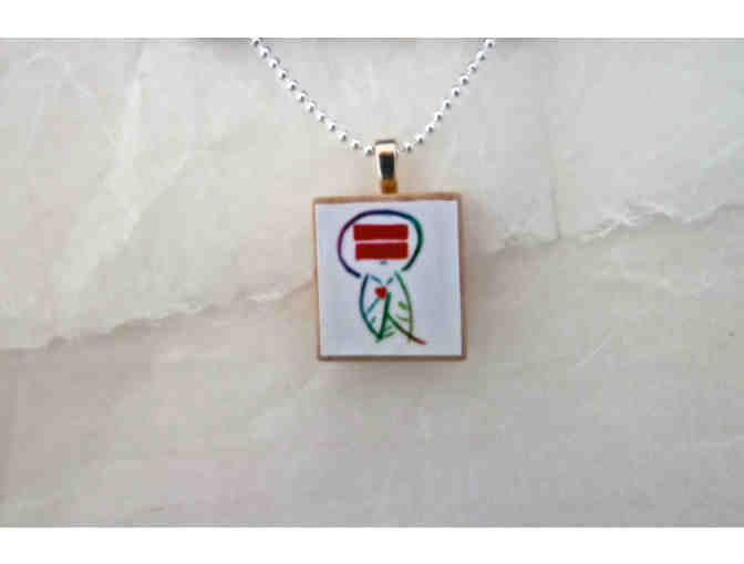 Jizo jewelry creator Valerie Johns "made this painting while the Supreme Court was deliberating on marriage rights and (she) wanted to express Jizo’s love for everyone." And here's the result, on a Scrabble tile, with 18″ silver plated chain, making a statement about love with his bright, red heart. Jizo Loves Everybody is for those who, well, love everybody!