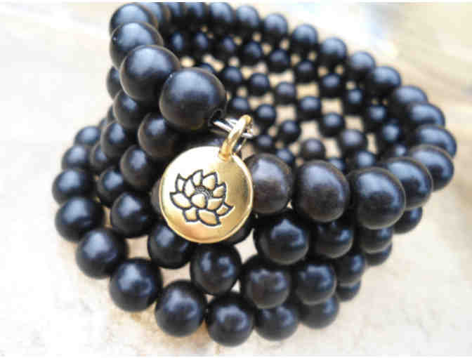 This 108 bead mala bracelet from Sacred Symbol Studios is made with natural black Ebony beads and a golden tierra cast pewter Lotus Flower Charm.