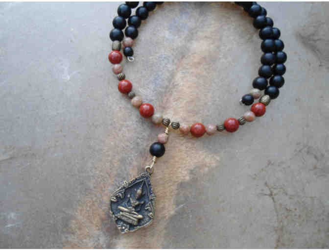 This choker from Sacred Symbol Studios combines ebony, Red Jasper, and Unakite beads, with a Thai Buddha brass amulet. With no clasp, it's easy to put on, take off, and is super comfy to wear.