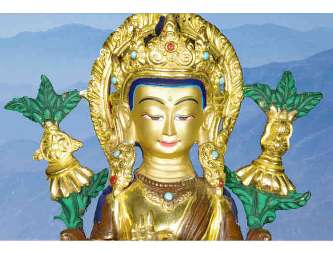 Tradewinds presents this beautiful copper and gold leaf statue of Maitreya Buddha handcrafted in Nepal.