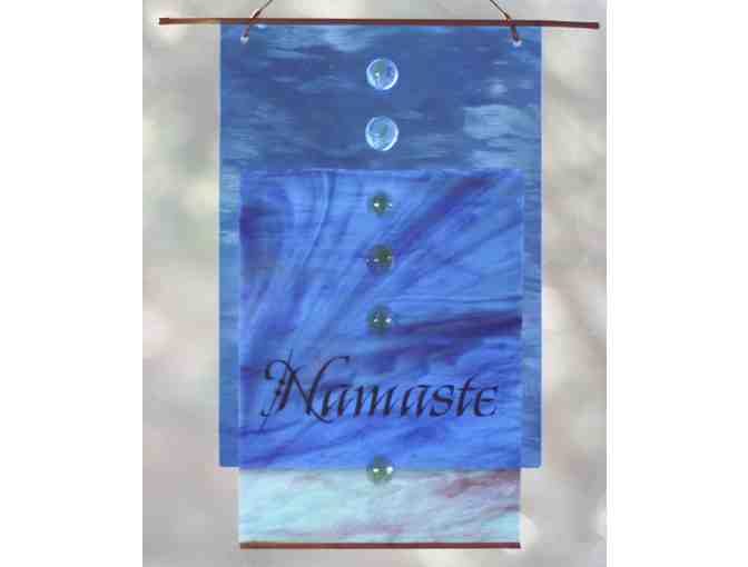 Namaste can be translated as "I greet the divine in you." These collages carry that simple word as a reminder. Made of layered colored glass, with glass beads representing the chakras, complemented with copper accents. Ready to hang in a window or on a wall.