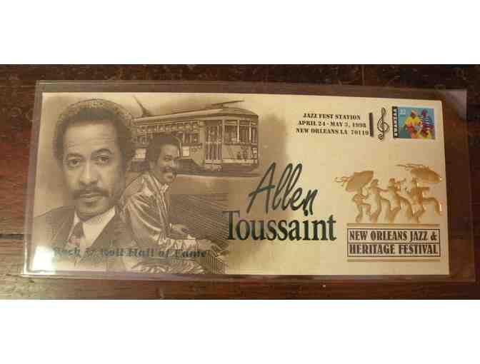 The winning bidder on this item will receive one 1998 Allen Toussaint New Orleans Jazz & Heritage Festival Official Commemorative Postal Cachet. The cache features a color collage, green and gold foil print, and a treble clef postmark. Total production of this cache was 2,500.