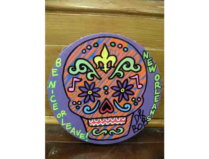 "Be Nice or Leave" tambourine with decorative skull and details by the venerable Dr. Bob,