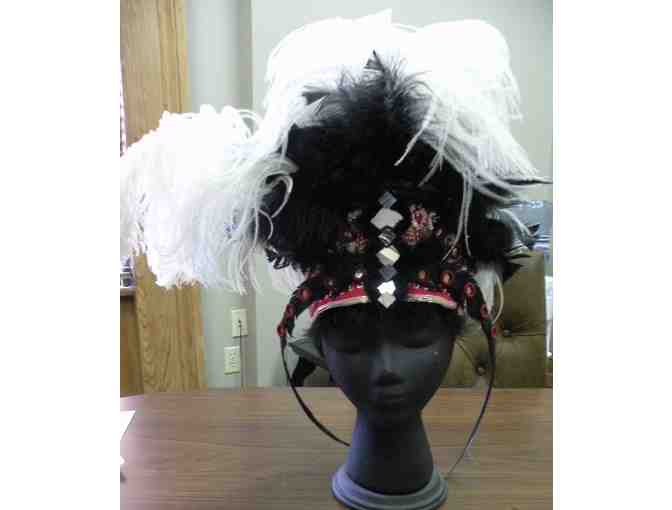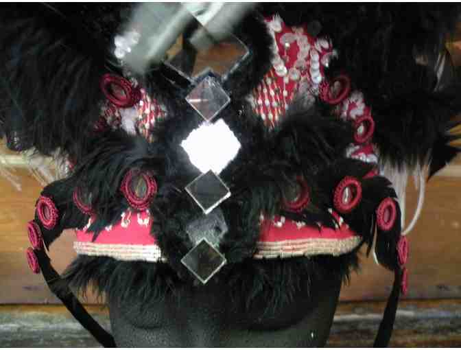 This festive asymetrical, marching band style headdress is red & black with mirrors and would be perfect for any fun or celebratory occasion!