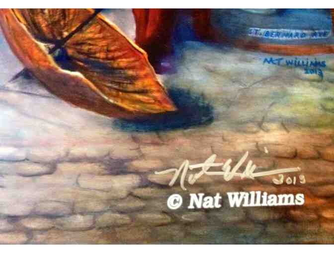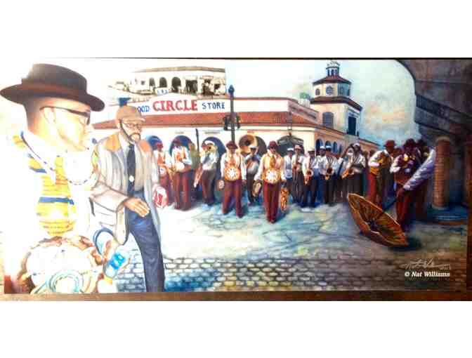 This "Circle Food Store" print, measured at 30"x15" by Nat Williams, is a depiction of the original painting that hung when the iconic grocery store was rebuilt after Hurricane Katrina and is signed by the artist. Circle Food Store has been a 7th Ward staple for decades and in the aftermath of Hurricane Katrina the store has been given new life.