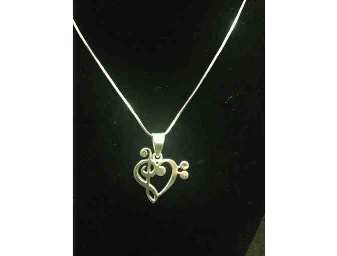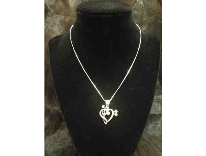 Music lovers and fashion lovers alike will certainly enjoy this unique silver treble & bass clef pendant necklace by metal artist Chester Allen.
