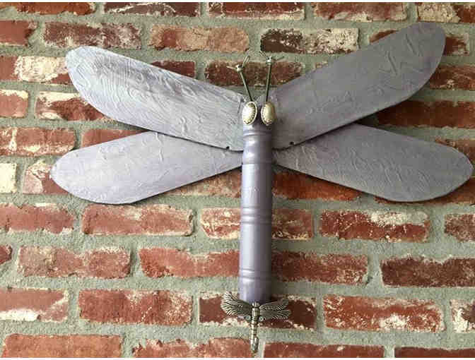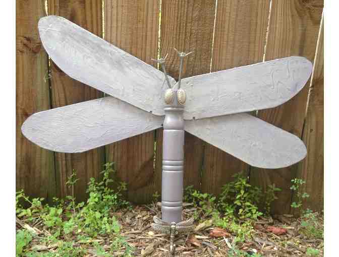 "Shililac" is a repurposed dragonfly made by Angel Tetrick that would be a perfect addition to any garden! Shililac is an original dragonfly creation made from all recycled and repurposed elements. This unique creation is treated for outdoor use and would enhance any fence, patio, entryway or interior wall.