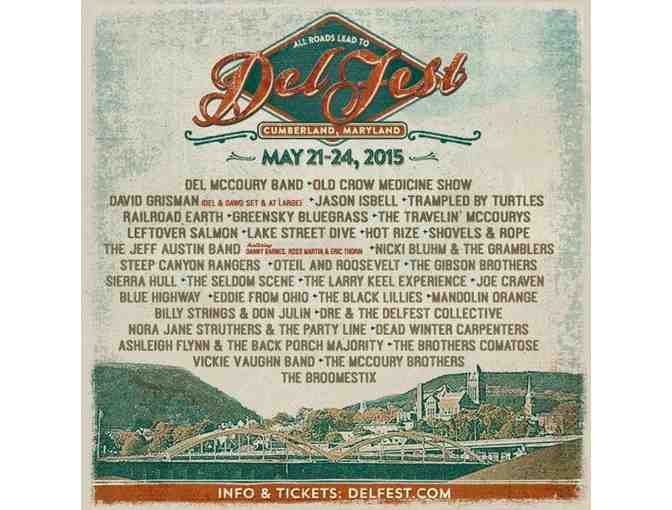 Two 4-day General Admission passes to the 8th Annual DelFest, May 21-24, 2015 in Cumberland, MD. DelFest was born from the desire to create a family-friendly music festival celebrating the rich legacy of McCoury music by providing a forum for world-class musical collaborations while also exposing fresh new talent.