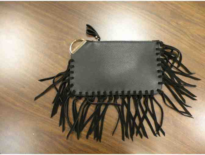 Feet First: Black leather fringe Inzi clutch with gold handware