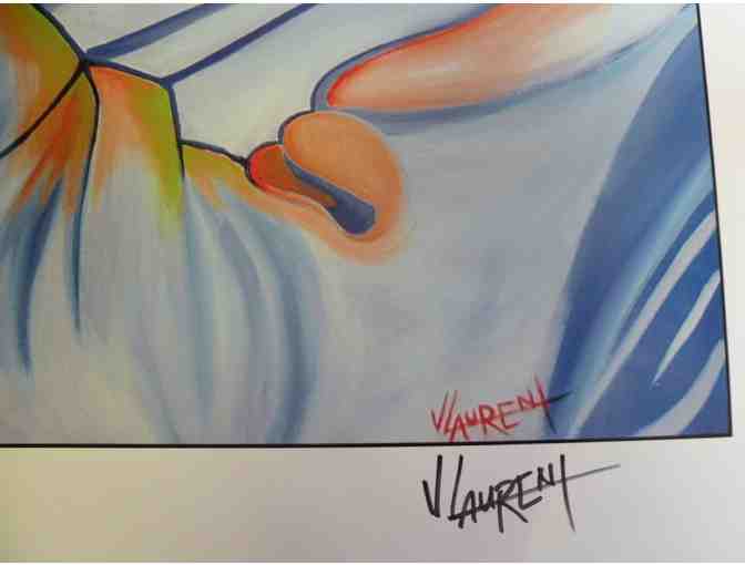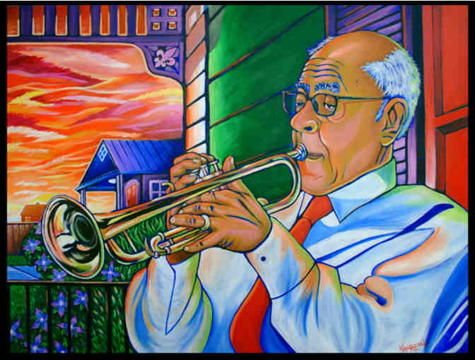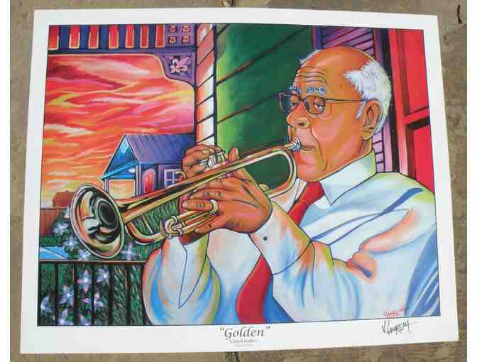 "Golden" is a colorful print of Lionel Ferbos playing the trumpet by Varion Laurent. This piece is sure to brighten up any room in your house or office.