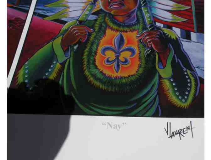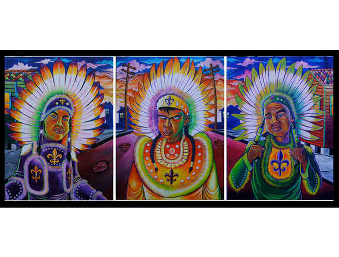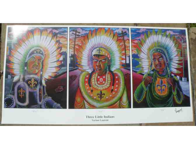 "Three Little Indians" is a colorful print depicting three Mardi Gras Indians in costume by Varion Laurent. This piece is sure to add a unique element to any room.