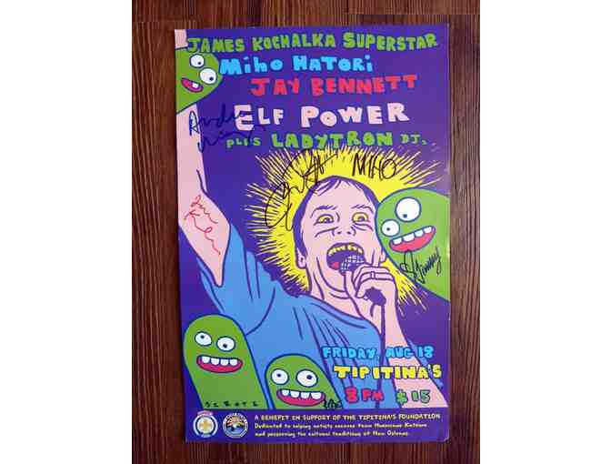 2006 Tipitina's Foundation benefit poster signed by artists James Kochalka Superstar, Miho Hatori, Jay Bennett, Elf Power and Ladytron DJs from August 18, 2006. Condition: very good to excellent. Measures approximately 11x17".