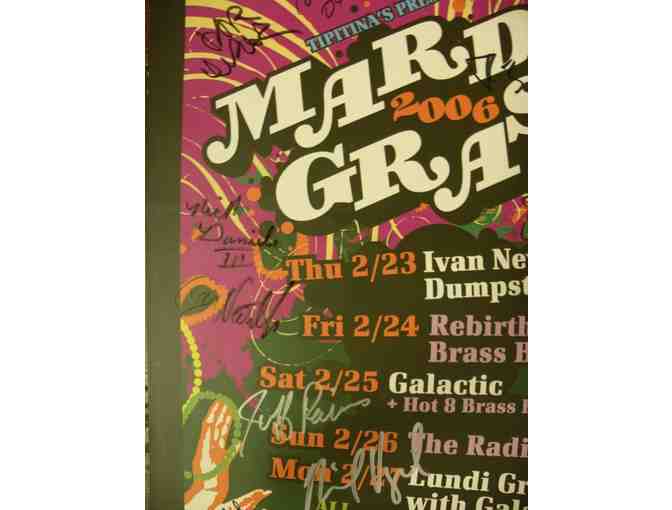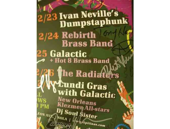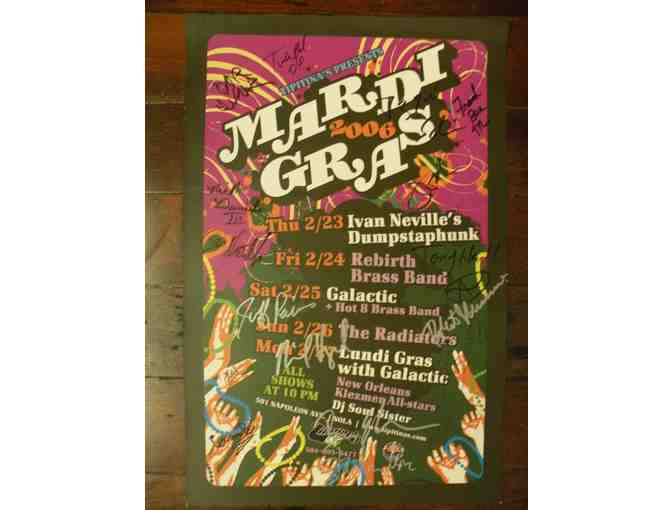 Signed Tipitina's Mardi Gras playbill from 2006. In Very Good condition, signed by performing bands and musicians such as Ivan Neville's Dumpstaphunk, Rebirth Brass Band, Galactic, The Radiators, and MORE. Measures approximately 11.5" x17.5".