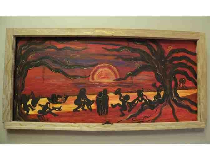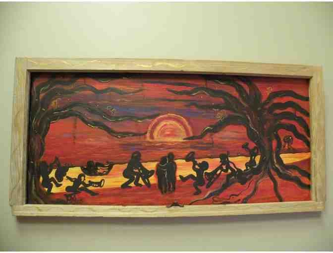 "New Orleans is a Wonderful World" is an original acrylic painting on wood by Mina Zavala Lanzas. This piece is framed with an antique cypress window frame and measures 48" x 23".
