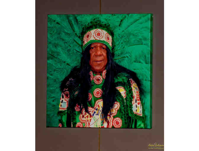 This photograph of Big Chief Monk Boudreaux was taken Mardi Gras Day, 2015 by Jerry Moran. The piece is museum wrapped on canvas, 1.5 inch image wrap, & measures 24" x 24". Signed by photographer and Big Chief Monk Boudreaux.