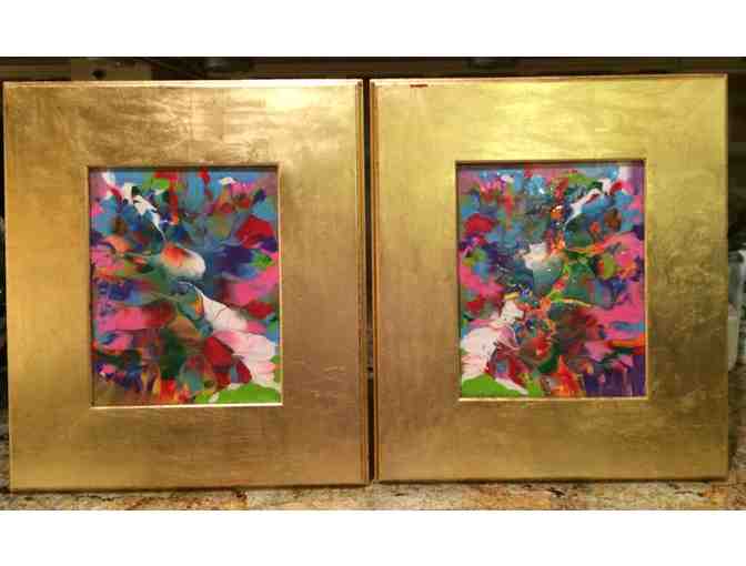 "Are You Happy Now? Parts I & II" by Mary Grace von Kurnatowski is an original diptych acrylic painting on canvas with custom 24 ct. gold leaf frames. The two pieces each measure 8" x 10".