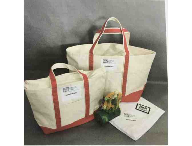 Two (2) Monogram boat bags (1 medium & 1 large); 6 monogram linen napkins; a vintage Asian figure, & a $50 gift card.