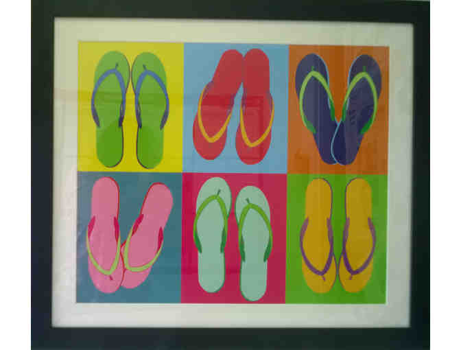 This colorful print, created with a nod to Andy Warhol, is the perfect artwork for your Hawaiian or Hawaiian-wanna-be home. It's kitcshy and doesn't take itself too serious yet is a bold statement at the same time. It is matted and framed in a contemporary white and black combination. It measures approximately 27"x31".