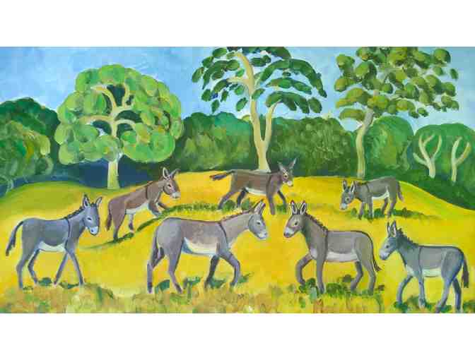 Talk about character! This original acrylic on canvas painting has it all! Entitled "Wai'ia Wanderers: Donkey Delight", this painting is charming enough, with its rustic, folk art style, to be spice up a fun breakfast nook or a child's room. Measures approximately 21"x13".