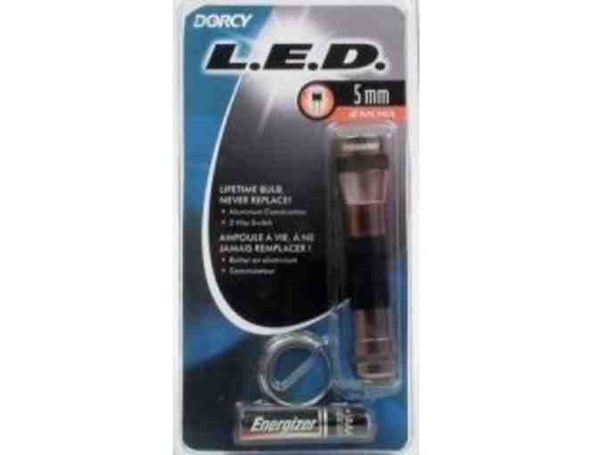 Dorcy 5mm 1AAA LED Flashlight w/ Battery & Keychain Ring 41-4224: Anodized aluminum construction with rubber comfort grip, Two-Way tail cap switch and durable metal keychain ring. approx. 6 hour run time before battery change is necessary.