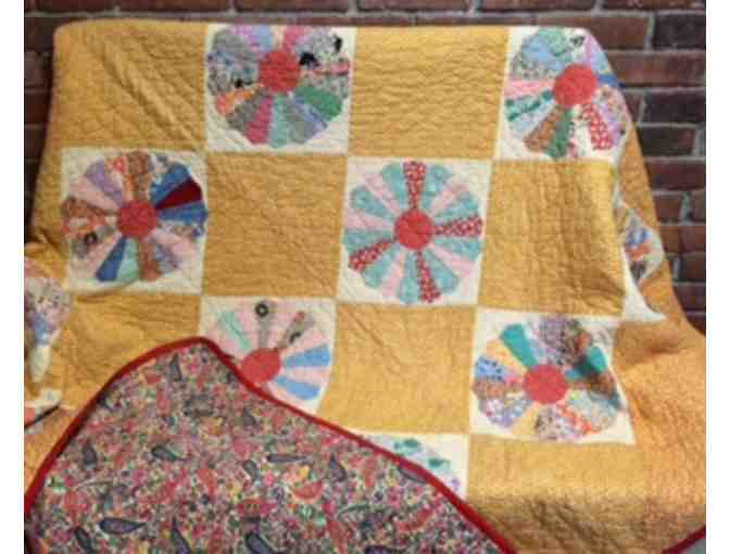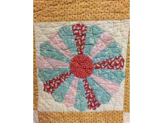 This vintage cheddar colored quilt measures 56"x72". It is hand and machine quilted, and is in excellent condition!