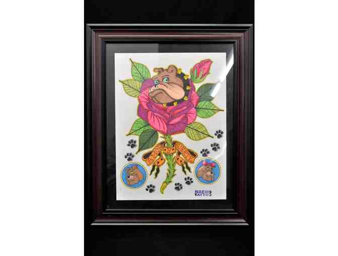 Nacho Tattoo is the famous tattoo parlour in Brooklyn NY. And this is one of their beautiful pieces of art Love and Luck! An original painting in markers and paints, it is on heavy duty watercolor paper and measures 9 x 12. Made in support of bulldog rescue - this is stunning!