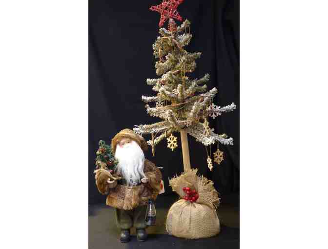 26" Flocked, Sparse Christmas Tree with Burlap Bundle Base. Decorated with rustic snowflake garland and snowflake ornaments. Santa (12") is thoughtful-looking and dons a fur coat and hat.