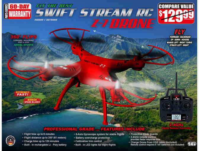 Swift Stream RC drone features flight time up to 8 minutes and a flight distance up to 200 feet. The battery has a charge time of up to 120 minutes and has overcharge protection. The drone can be calibrated for trim control and has 6-axis Gyroscope system for stable flights. Intended for ages 14 and up.