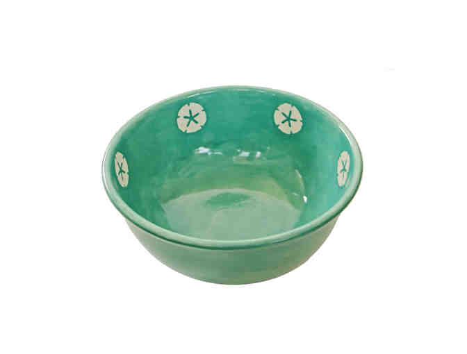 9" handmade pottery bowl. Green with white sandollars. Made by local artist Virginia Townsend.