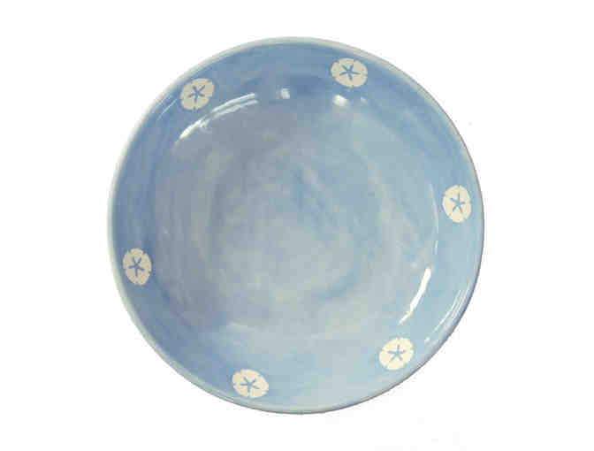 12" handmade pottery pasta bowl. Light blue with white sandollars. Made by local artist Virginia Townsend.