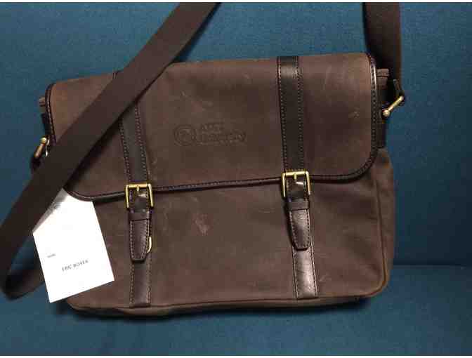 This dark brown messenger-style bag is embossed with the AT&T University logo. It is made by Fossil, whose website describes the bag's "waxed Calvary twill and vintage-inspired buckles."