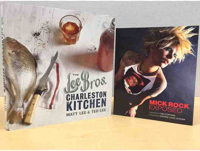 Autographed Mick Rock Exposed and Lee Bros. Charleston Kitchen books.