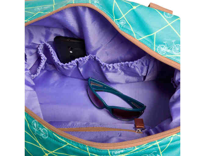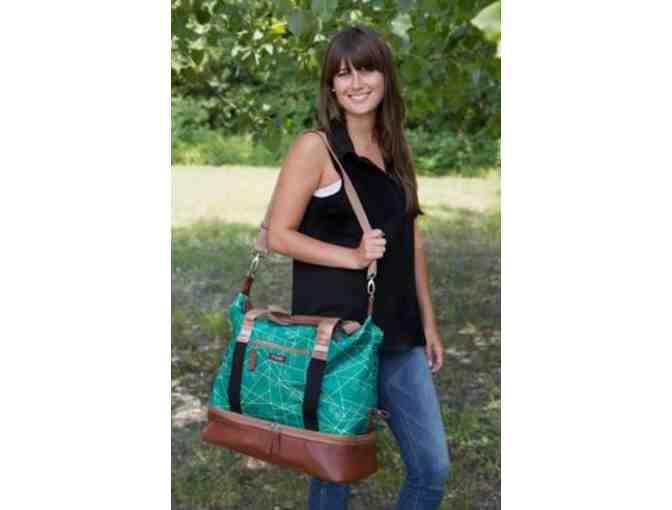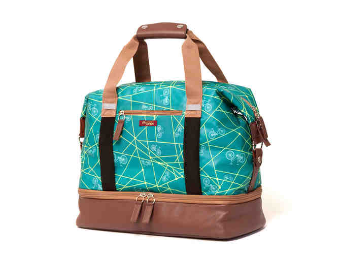 Our Weekender is made with vegan, weatherproof fabric and has reflective accents. Includes a detachable and adjustable shoulder strap to carry as a crossbody bag.