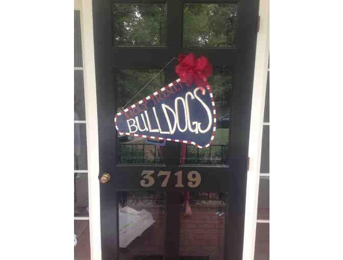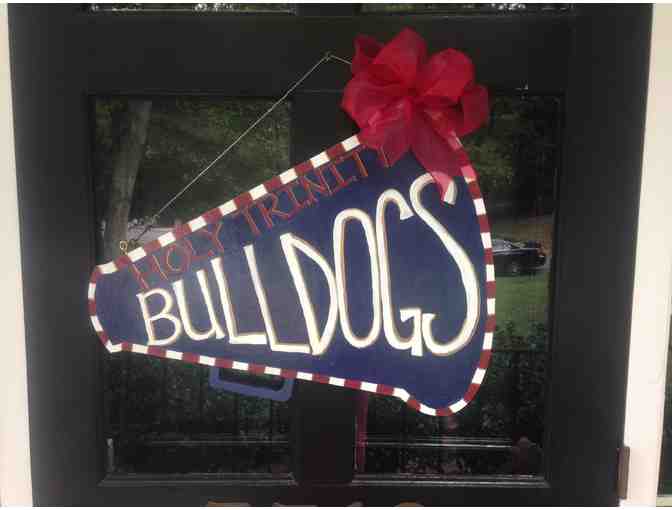 Hang some genuine Bulldog Pride on your front door. This gorgeous hand-painted megaphone door ornament was designed and painted by Holy Trinity parent, Arden Brewer.