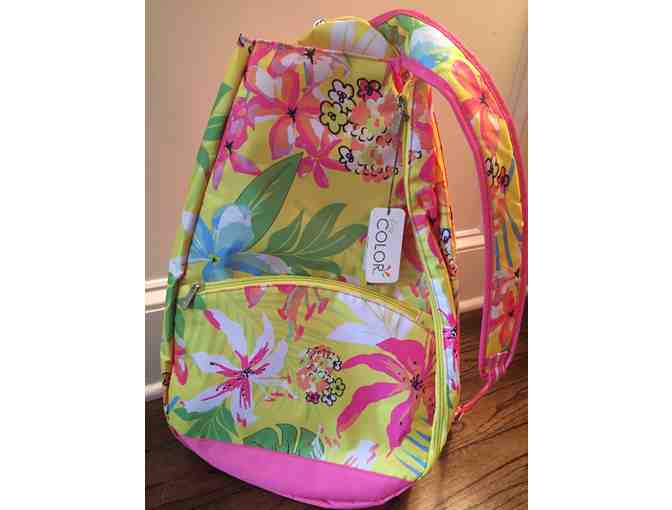 Hit the courts this Fall with an All For Color tennis bag! This spacious tennis bag features a front compartment that holds two raquets. It features numerous interior compartments and several clips, zippers and pockets.