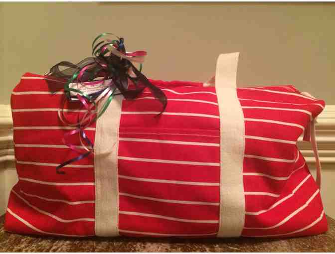 Travel in style with this Red and White Stripe Cotton Canvas Duffle Bag offered by Alphabet Soup. Also included is a monogram of your choice.