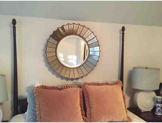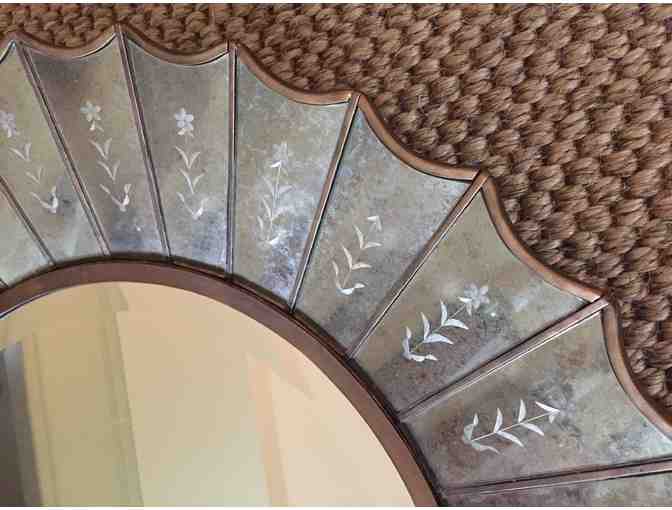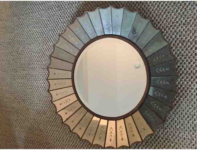A beautiful sculpted mirror with etching on the glass. 31" across.