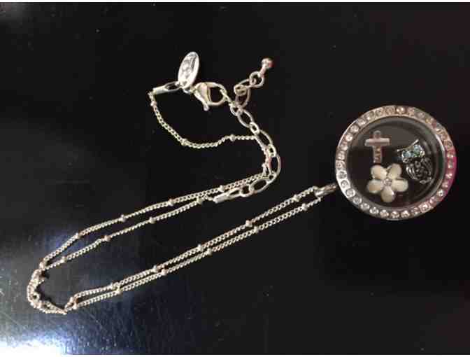 Beautiful and unique silver charm necklace, featuring a base that holds 3 charms-a cross, flower and an owl.