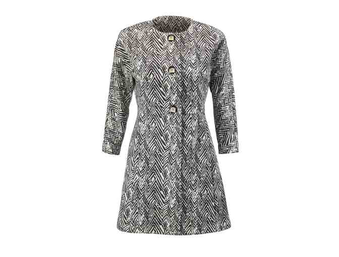 The Zigzag Jacket is a throwback to the ’60s in an eye-catching graphic print. Done in a ponte fabric with seaming to define the waist and has added vintage-inspired buttons for an element of fun. The three-quarter sleeves and in-seam pockets make this a fashionable and wearable piece.
