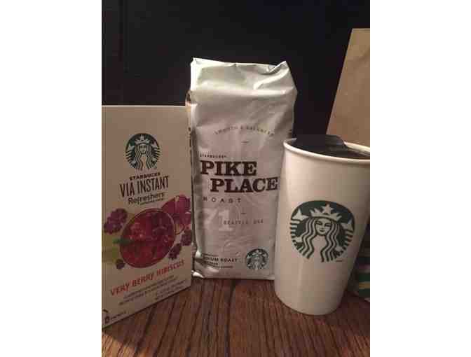 Starbucks Gift Bag which includes, $20.00 Starbucks Gift Card, 1lb of Starbucks Coffee Beans Pike Place Roast, Starbucks 12 oz. ($12.00) Double Wall Ceramic Traveler ($14.95). 5 Pack Starbucks Very Berry Hibiscus Via Instant Refreshers Instant Beverage wiht Green Coffee Extract ($5.95)