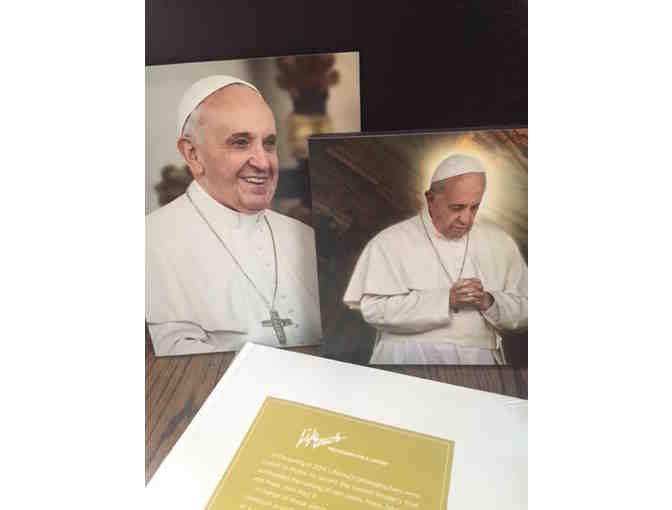 Two (2) LifeTouch Pictures of Pope Francis Mounted to Board and A Beautiful Coffee Table Book, Rite of Cannonization, The Naming of Saints, Pope John XXIII & Pope John Paul II. (Our Church is doubly blessed to have two popes canonized as saints by Pope Francis. Saint John XXIII & Saint John Paul II are now numbered among the saints in heaven. In the Spring of 2014, Lifetouch photographers were invited to Rome to record the sacred imagery that surrounded the naming of these two saints. Lifetouch offers this book as a commemoration of this historic and unprecedented moment for the Roman Catholic Church.